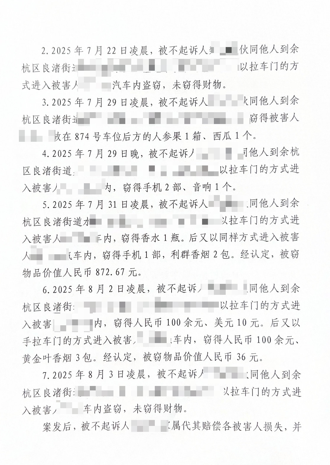 2025年7月至8月,行为人跟随同伙先后7次在杭州市余杭区良渚街道实施拉车门盗窃,窃取现金、香烟、手机等财物,行为人在盗窃过程中主要负责望风,构成共同犯罪。